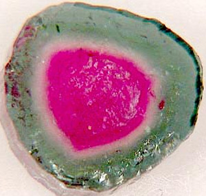 様々な色彩があるトルマリンのなかで、その名の通りスイカを連想させるォーターメロントルマリンは、上の画像の様な、最も自然の結晶状態に近い、原型を留めた状態での輪切りタイプのモノや、下の画像の様なカットされたモノもあります