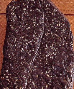 この梅花石は3億5000年前の火山活動の盛んな当時の海底に繁殖した棘皮動物の一種であるウミユリや火山灰が岩石化したものです。