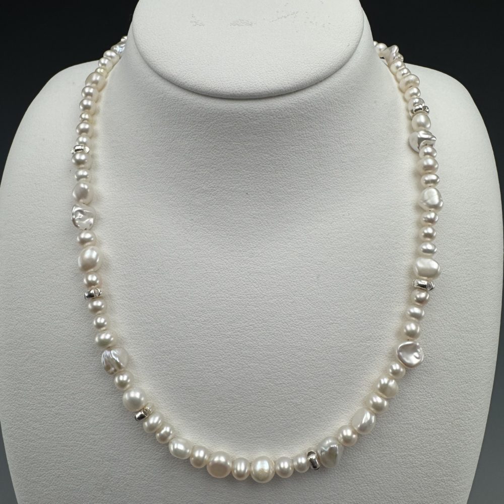 真珠と真珠の間にシルバーのパーツを使用したいとの事で、お客様からのご指定のパーツを組み込みました。